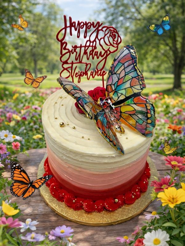 White and pink cake with pink butterflies flying off cake.