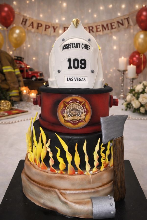 yellow Cake with fire chief helmet and badge o