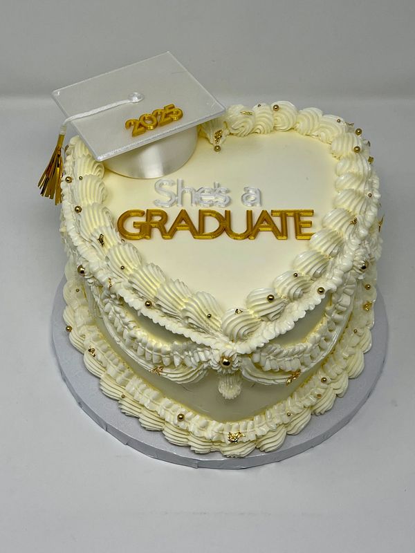 White naked cake with fresh flowers and black graduation cap
