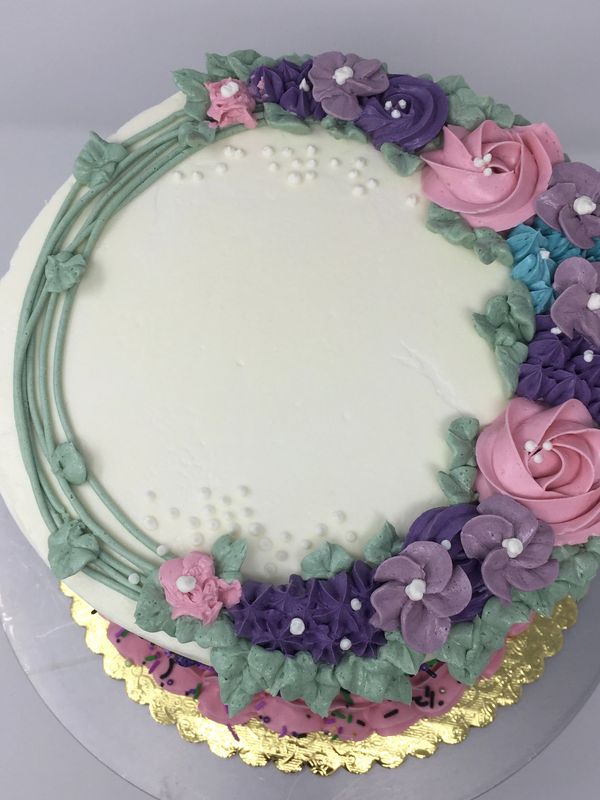 white cake with purple flowers.